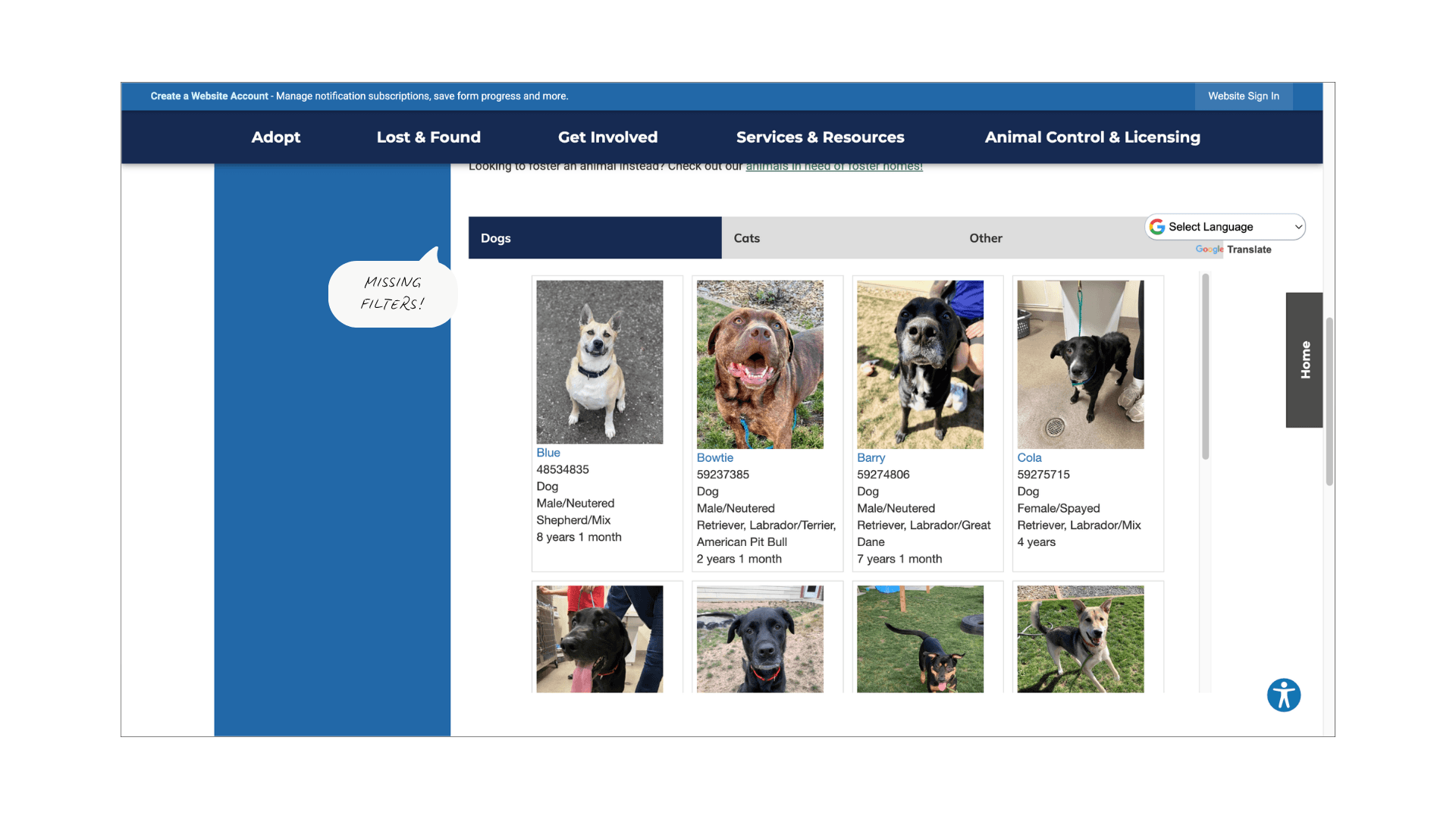 #1 Browse Adoptable Pets | Find a family-friendly dog | 60% | 25.6 sec | No filters, cluttered layout |