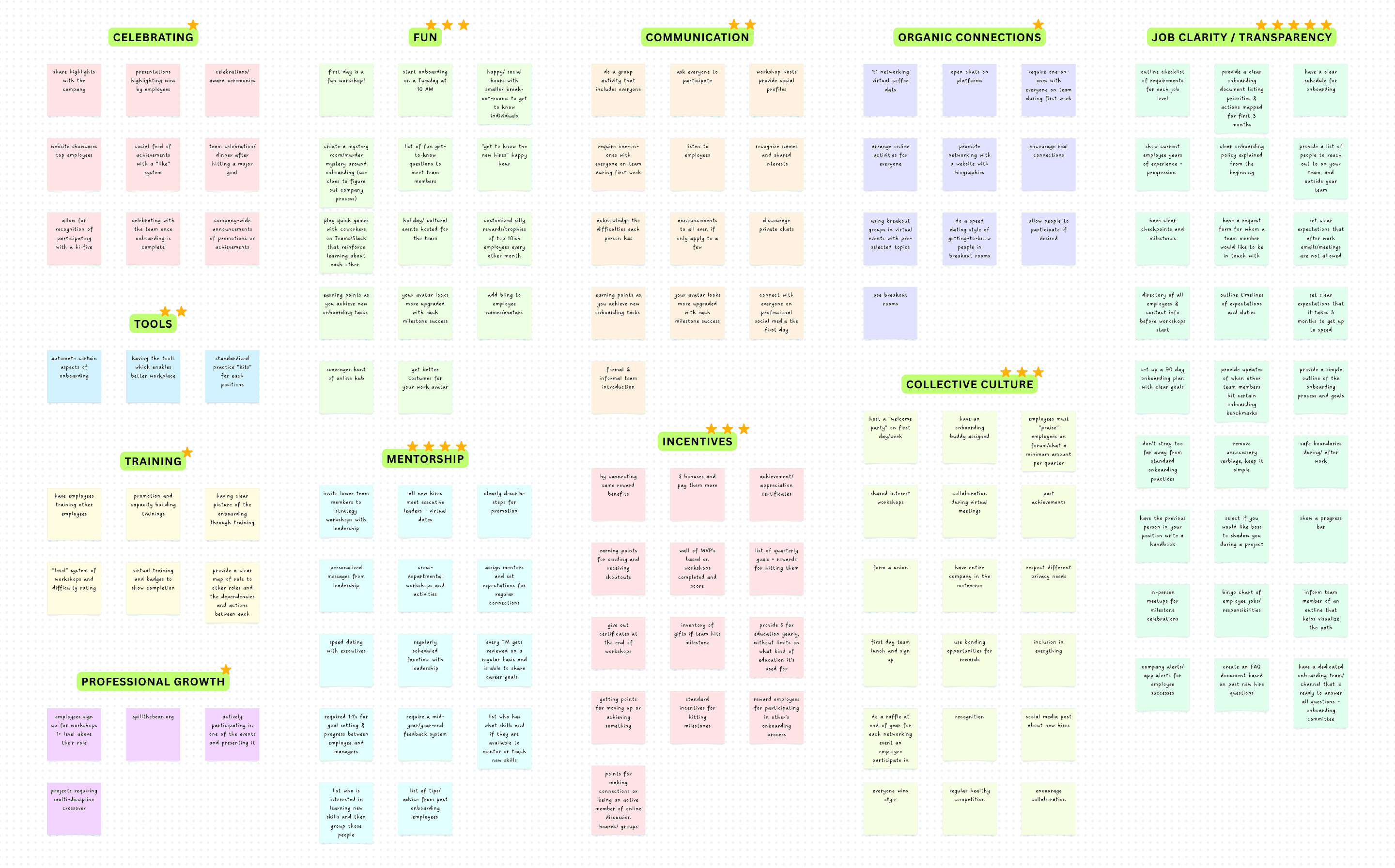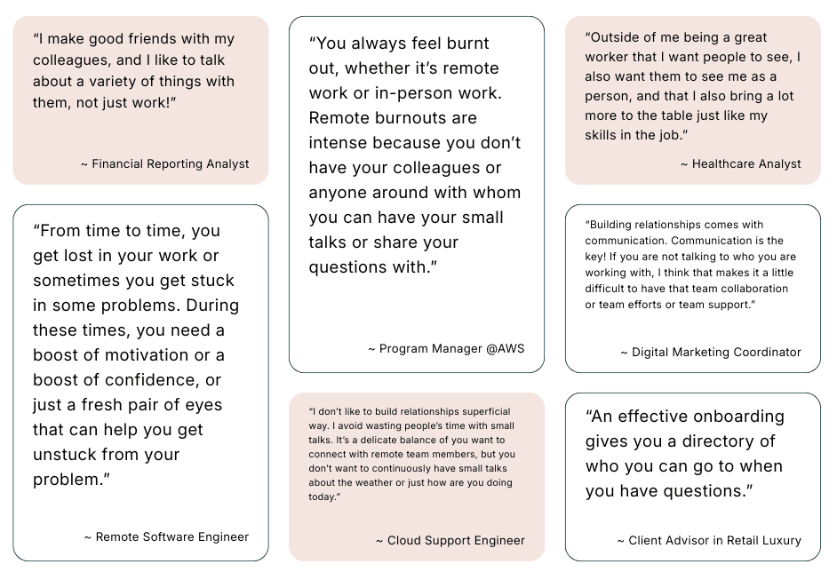 To better understand the remote onboarding experience, my team and I conducted 16 semi-structured interviews across roles and industries. Then we synthesized findings using the Jobs-to-Be-Done framework, focusing on motivations, frustrations, and unmet needs.