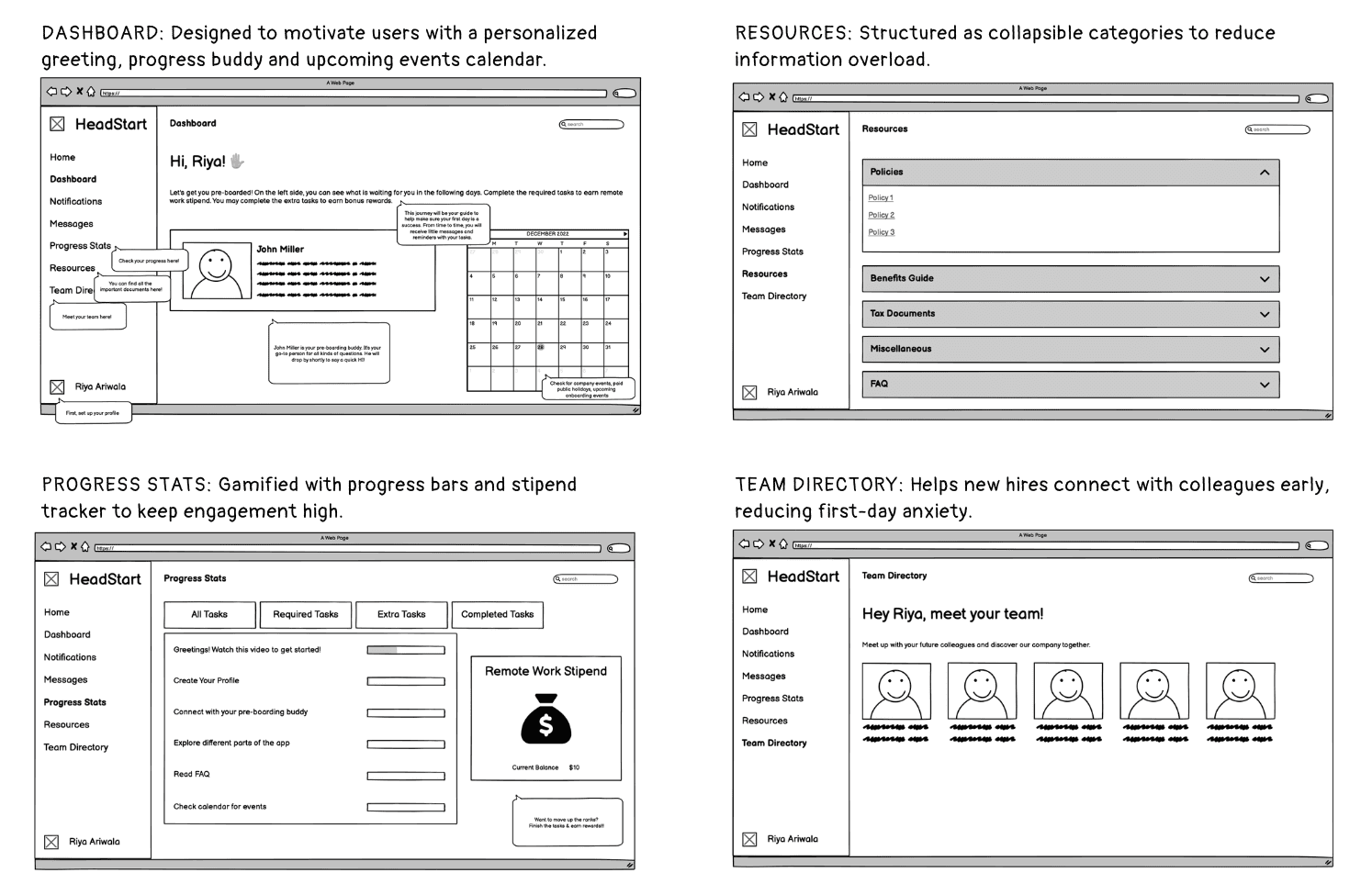 I proposed Headstart, a pre-boarding platform that supports remote new hires through structured guidance, meaningful touchpoints, and light gamification.